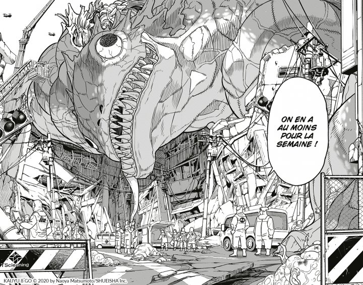 La chasse aux Kaijus ou autres grosses bestioles, de chair et/ou artificielles, est un grand classique du manga et de l’anime. Souvent, cela flirte avec – ou franchit même allégrement – la limite du porn destruction, en se concentrant beaucoup sur les figures héroïques et leurs combats, mais assez peu sur les dommages collatéraux, encore moins sur les conséquences immédiates ou plus lointaines. Naoya Matsumoto semble bien décider à creuser la question du « concrètement, ça pourrait donner quoi ? ». Dans l’univers qu’il décrit, où le Japon est quasi quotidiennement attaqué, il intègre cette composante : il y a certes des unités de combat contre ces bestioles, mais aussi la question de l’évacuation de leurs dépouilles, et même de l’exploitation économique, les kaijus contenant des matières premières, qui en sera faite. Il n’est en effet pas totalement sot de se demander comment évoquer régulièrement des carcasses dont les dimensions s’apprécient en dizaines de mètres et de tonnes. Les habitants quant à eux semblent plutôt s’y être résolus, dans une résilience comparable à celle forgée face aux catastrophes naturelles, technologiques ou militaires. Ce n’est pas pour rien si le kaiju est un mythe japonais.