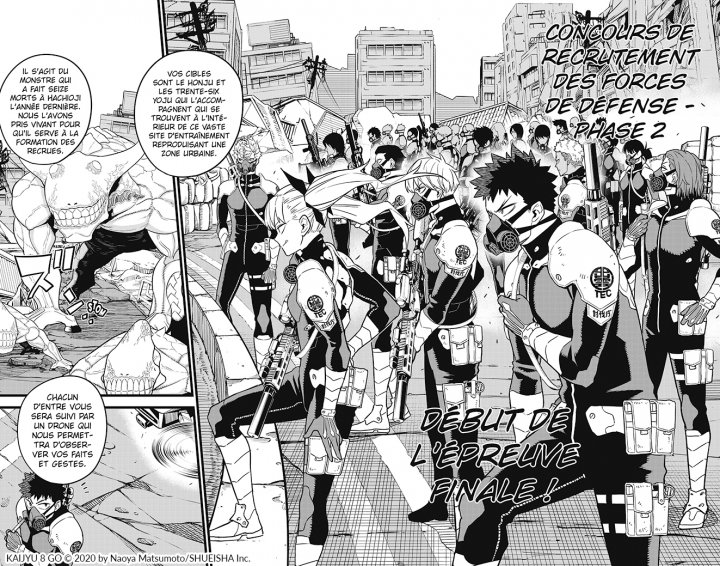 Comme dans SNK, les chasseurs de kaijus opèrent au sein d’unités d’infanterie nommées « forces de défense » mais, monde contemporain oblige, dotées d’armes à feu ainsi que de combinaisons qui accroissent très nettement leurs capacités physiques. De fait, la plupart des créatures géantes, mais stupides, ne sont que du menu fretin pour l’élite des forces de défense. A nouveau, le récit est très classique avec les habituelles épreuves qui permettent d’expliquer un peu l’univers, de mettre en scène une galerie de personnages badass (avec une représentation féminine appréciable), d’introduire un antagoniste et permettre au héros… d’être héroïque. L’arc de l’examen Chunin de Naruto, surtout la forêt, étant un de mes favoris, j’ai plutôt apprécié. On trouvera également l’habituel quantification de la puissance, ici en pourcentage, chère à l’esprit japonais. Surtout, c’est un tome très généreux : il y a beaucoup de péripéties et d’action ; le trait de Naoya Matsumoto est net et il gère parfaitement les différences d’échelle ainsi que les effets de puissance, notamment le destructeur crochet du gauche de Kafka. Le mangaka nous livre un bon et solide shonen, qui ajoute donc une étape supplémentaire dans l’évolution actuelle du genre, avec des personnages qui intègrent une part monstrueuse, tout en s’inscrivant dans la tradition, ici incarnée par les kaijus. Kazé a bien fait de rapidement traduire ce titre qui plaira aux jeunes mais aussi éventuellement à un lectorat plus âgé qui cherche à se divertir. Fiston et/ou moi-même liront la suite avec plaisir.