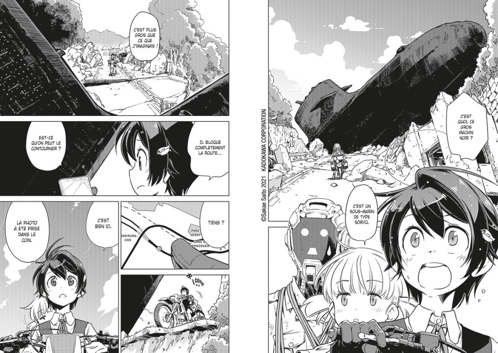 Sakae Saito est aussi à l’aise avec son histoire qu’avec les dessins. Un manga sur le thème du voyage, et encore plus quand les personnages se promènent et cherchent des paysages précis, nécessite une quantité de travail phénoménale, entre documentation et exécution des planches. Et le mangaka est généreux en nous proposant de superbes et vastes cases où le Japon est à l’honneur, il a à cœur de nous faire visiter ses lieux emblématiques. Le trait est particulièrement soigné, pour tous les éléments, personnages, décors évidemment, et aussi les véhicules. Il explique d’ailleurs dans les pages de fin de chapitre l’amour qu’il porte à la moto qu’utilisent les héroïnes (version électrique of course) pour avoir lui-même fait des road trip avec ce modèle ; elle est une sorte de troisième personnage et apparait sur de nombreuses pages. Le premier chapitre, avec un char d’assaut devenu fou, est clairement un petit plaisir de l’auteur. Enfin, il propose un découpage toujours réussi, avec des cadrages parfaitement adaptés à son intention, qu’il s’agisse de mettre en scène action ou contemplation.