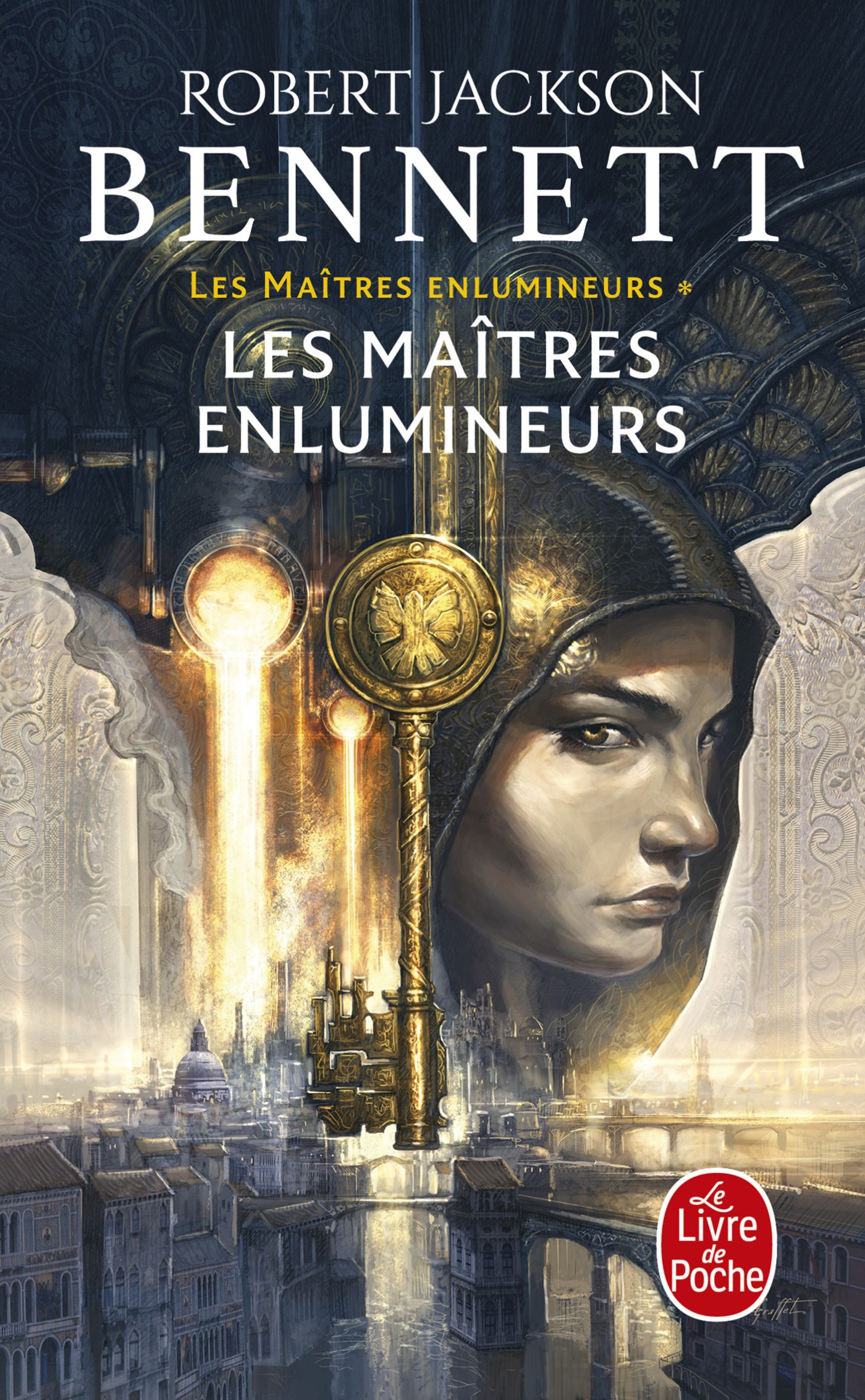 Les Maîtres enlumineurs de Robert Jackson Bennett, traduit par Laurent Philibert-Caillat, couverture de Didier Graffet, aux éditions Le Livre de Poche (2024, première édition VF chez Albin Michel Imaginaire en 2021, parution VO en 2018), 768 pages.
