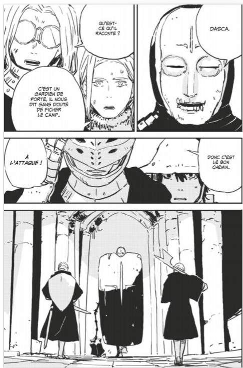 Néanmoins, ces choix graphiques et l’apparent classicisme permettent à Tsutomu Nihei de donner une ambiance très particulière à Tower Dungeon. Les créatures rencontrées par notre bande de héros ne correspondent pas tout à fait aux clichés du médiéval fantastique. Dès les premières pages, le nécromancien a une allure très particulière, « malaisante » si j’emploie un mot de jeunes. Et quand on gravit les étages, le décalage entre nos connaissances de lectrice ou lecteur et ce que propose l’auteur s’accroit, et tout particulièrement avec le canonique dragon. L’auteur s’approprie l’architecture, le bestiaire, pour créer un réel sentiment de malaise, et nous rappelle peut-être le sens du mot monstre, quand notre imaginaire est déjà saturé par des créatures hors-norme. D’autant plus que quand l’univers commence à s’esquisser – après tout, ce n’est qu’un premier tome – le bizarre et le dérangeant semblent finalement y être davantage la norme que l’exception. Ce qui nous choque semble normal aux protagonistes : soulever seul un énorme rocher, une tour gigantesque qui lévite… Après tout, il s’agit d’un seinen, estampillé dark fantasy, et on sent que Nihei a l’intention de proposer davantage qu’un simple porte/monstre/trésor. Un tome d’introduction qui a donc su me captiver et m’intriguer, en vieux routard parfois blasé – ou condescendant – que je suis. Vivement la suite.