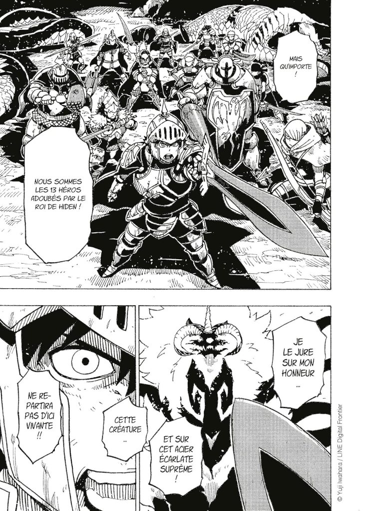 Le format de prépublication des mangas, et la nécessité d’accrocher dès les premières pages, ouvre sur un classique in media res : une bande de héros, équipés chacun d’une arme magique – c’est encore plus visible dans l’anime – fait face à une créature aux allures de Kyubi, cornes et flammes en prime. Les codes d’un monde d’Heroic Fantasy sont évidents, avec des personnages aux designs très marqués et l’affrontement humains versus monstres. Il faut attendre la fin de ce premier chapitre pour comprendre les tenants et aboutissants, et avoir plus de contexte : plusieurs espèces humanoïdes peuplent le monde avec des territoires bien délimités. Point d’Elfes, Nains ou Orcs, mais ça y ressemble tout de même furieusement. Les Hidens pourraient être comparés aux premiers, et ont surtout un roi qui a la capacité de forger les armes évoquées plus tôt, celles-ci servant à équiper les héros qui vont combattre les démons, dans un monde qui semble plutôt low magic. Car le monde est en réalité étroitement circonscrit, étriqué même, les points cardinaux étant contrôlés par de puissantes entités, qui veillent jalousement sur les territoires derrières elles. Les héros seraient donc animés par une quête supérieure, qui les dépasse : élargir l’univers, au péril de leur vie.