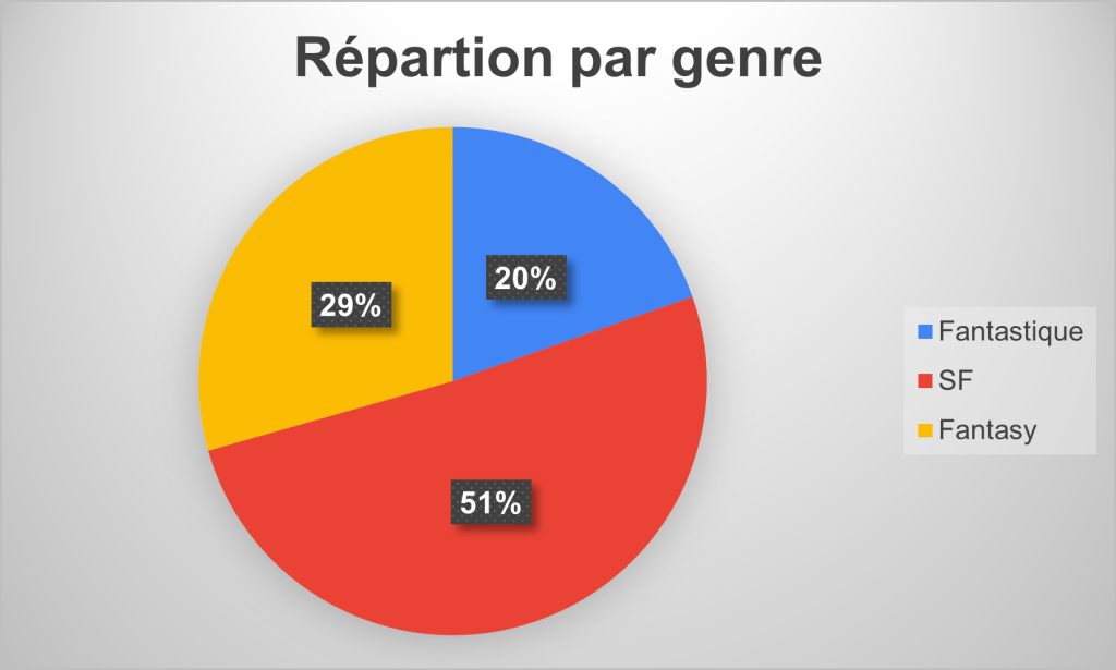 Je ne sais pas si ces statistiques se maintiendront car j’ai décidé d’écarter les cycles de mon Prix, et ça aura aussi peut-être un impact sur le total de Fantasy, ce genre étant souvent écrit en fresques.