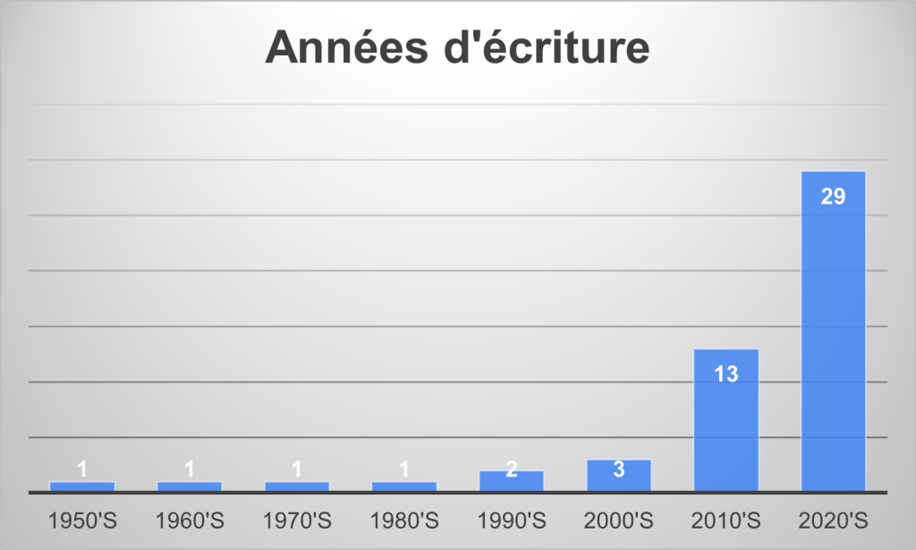 Notons une majorité de livres récents, sortis dans les années 2020, voire 2010. Certains auteurs sont peut-être traduits plus rapidement, et il faut aussi ajouter les plumes francophones, dont la plupart de ces publications sont une première édition au format poche.